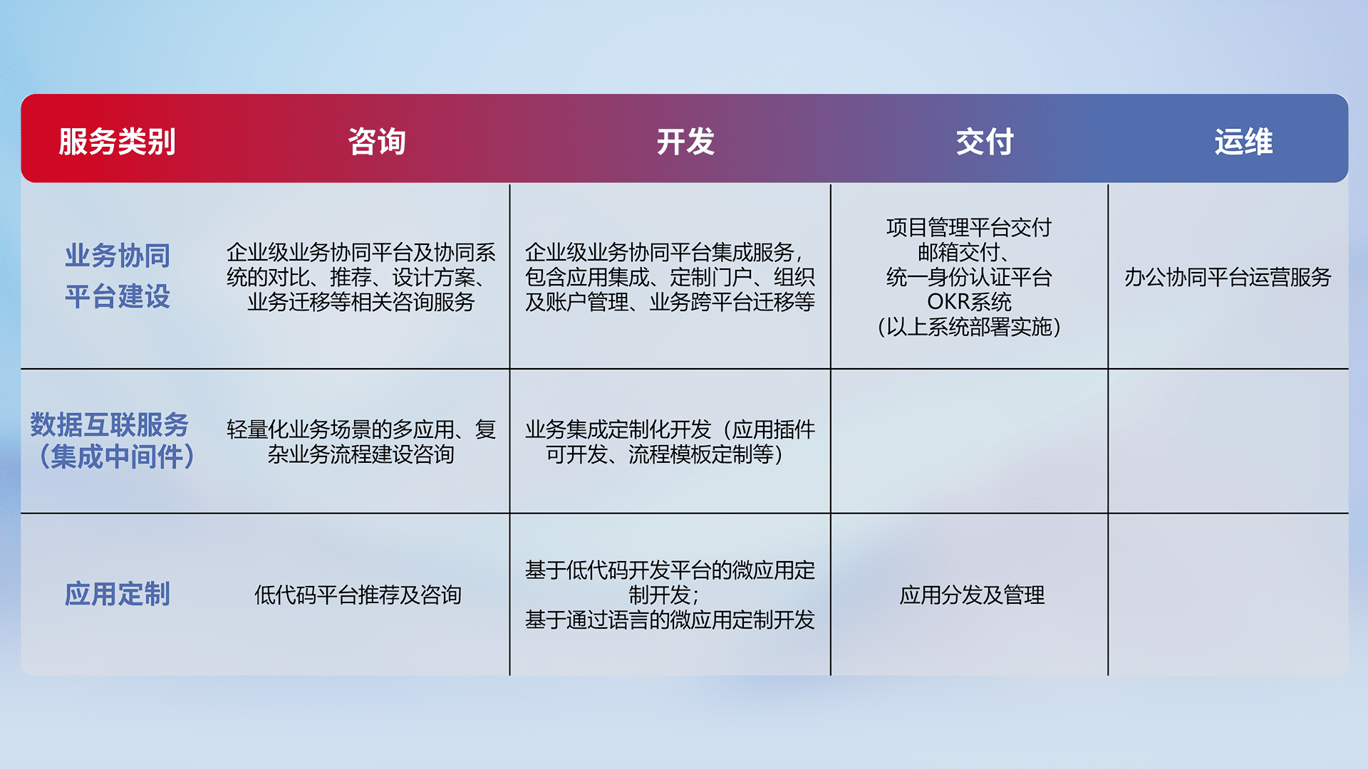 针对钉钉、、、、企微、、、IDaas等平台级产品提供产品的规划、、方案、、交付、、、、定制化开发等服务,,,,实现如统一协同办公、、、、智能客户服务、、混合会议管理、、智能数据查询、、、等业务场景,,实现数字化转型。。。
